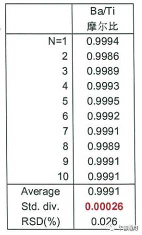 理學公司的X射線熒光光譜儀掃描道ZSX Primus III+對鈦酸鋇粉末質(zhì)量管理,其鈦鋇比標準偏差(摩爾比)~10-4。根據(jù)實測結(jié)果,ZSX Primus III+的精度在0.0002~0.0003。
